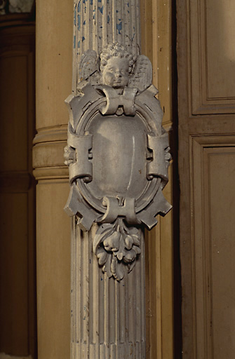colonne : rudenture, chapiteau composite, cartouche : angelot, IHS