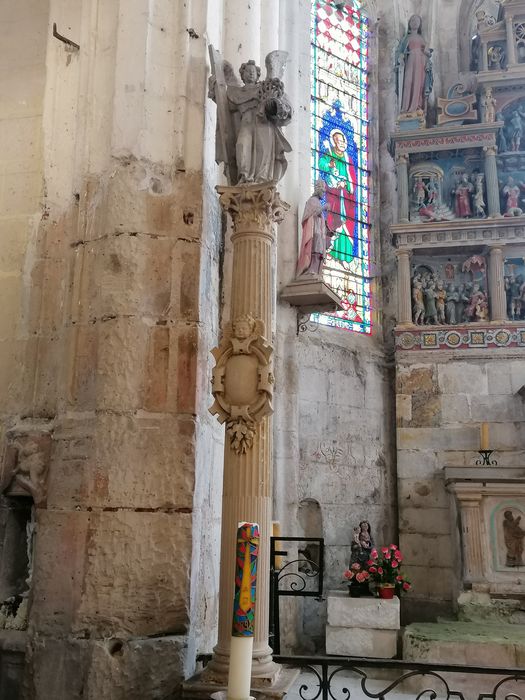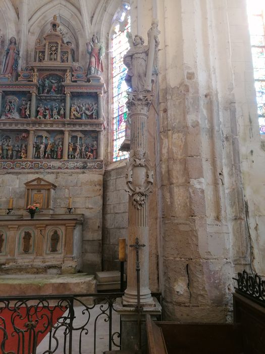 Ensemble homogène daté de la seconde moitié du 16e siècle ; les colonnes surmontées de statues sont situées en pendant de part et d'autre de l'entrée du choeur ; l'arrêté de classement mentionne la présence d'armoiries, elles doivent se trouver sous le badigeon dans l'un des cartouches.