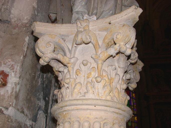 Deux statues sont posées sur les hautes colonnes cannelées et rudentées à chapiteau composite et ornées de cartouches ovales à tête d'angelot ; sous le badigeon gris on devine encore sur l'un des cartouches l'inscription IHS.