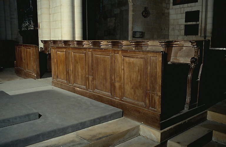 stalles (22) ; accotoir (24) ; miséricordes (22) ; pupitre