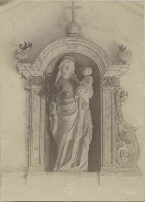 La Vierge, déhanchée, porte son Enfant sur le bras gauche et tenait une fleur de lys dans sa main droite. Elle est voilée et couronnée et porte une longue robe ceinturée sous la poitrine et un manteau ramené sous son bras gauche qui forme des plis curvilignes sur l'avant de la silhouette et s'enroule sur ses flancs. L'Enfant, torse nu, tient de ses deux mains un oiseau et lève les yeux, au contraire de sa Mère dont le regard se dirige vers le bas.