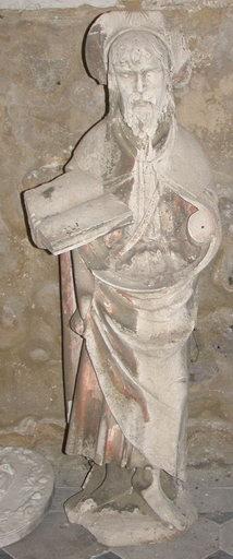 Le bâton de pèlerin a disparu. Il subsiste quelques traces de polychromie. La pierre est rongée.