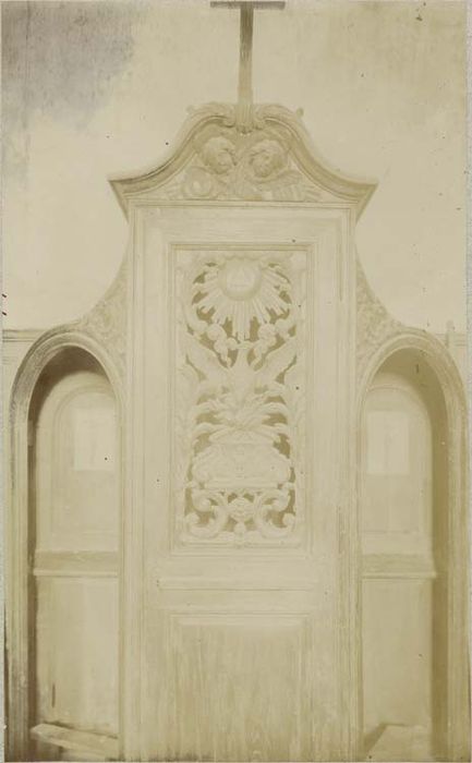 Le décor se répartit sur la porte centrale, au-dessus de cette porte et au-dessus des ailes latérales. La porte est sculptée d'un phénix renaissant de ses cendres dans sa partie supérieure. Sur le fronton au-dessus de cette porte, deux anges ailés. Au-dessus des ailes latérales, des palmes.