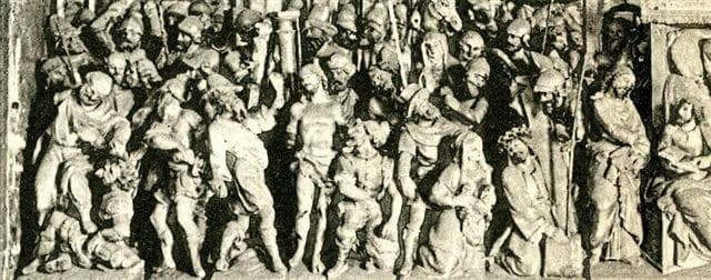 Huit éléments sculptés du premier registre de la partie basse des panneaux ont disparu dans les années 1960-1970. Panneau de gauche : un soldat de l'arrestation du Christ au jardin des oliviers (personnage de l'extrême droite de la scène) ; un bourreau debout, le Christ flagellé et un bourreau accroupi (chacun des trois éléments étant indépendant des deux autres) ; un homme debout et sainte Véronique agenouillée (éléments solidaires) et le Christ tombé sous la croix (élément indépendant). Panneau central : l'apôtre de profil à l'extrême droite. Panneau de droite : saint Nicomède et saint Joseph d'Arimathie déposant le corps du Christ sur le tombeau, une sainte femme penchée au-dessus du Christ. Le Christ tombé sous la croix a été identifié dans le commerce en 2010, la mise au tombeau est passé en vente en 2003.