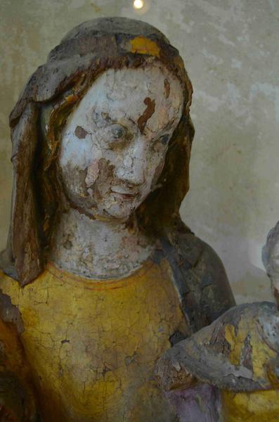Vermoulures abondantes. Les mains de l'Enfant et une partie des mains de la Vierge manquent. La base de la statue est rongée par les xylophages. La couronne de la Vierge manque.
