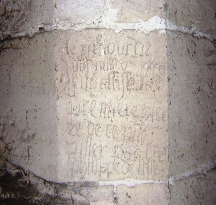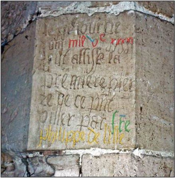 gravée sur une pierre d'appareil de la pile sud-ouest de la croisée du transept, au niveau des combles de la croisée, sous le clocher