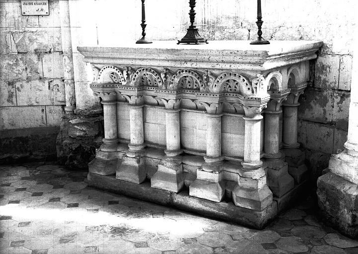 Autel en pierre taillée, orné de colonnettes et d'un décor sculpté en relief. Le rebord de la table d'autel est sculpté d'un tore circulaire et d'un chanfrein.