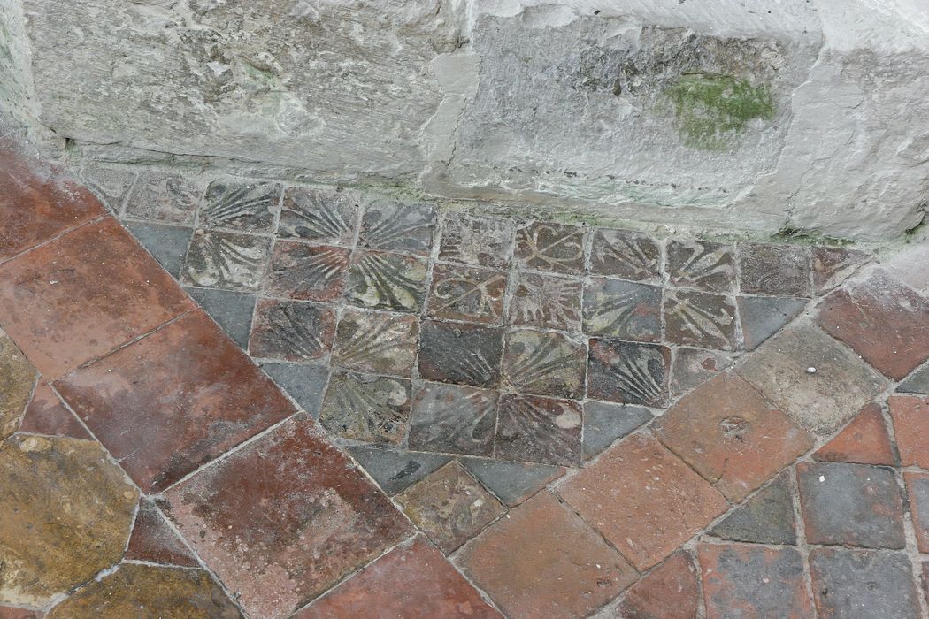 Les carreaux présentent quatre motifs de décor différents. Sur deux carreaux, un aigle aux ailes déployées. Sur dix-huit carreaux, une fleur de lys. Deux types de fleurs de lys se distinguent : une avec trois grands pétales et des petites tiges intercalées et l'autre sans tiges. Sur trois carreaux, un animal fantastique. Sur deux carreaux, un motif décoratif. D'autres carreaux contemporains, non classés, sont conservés entre les quatrième et cinquième supports sud de la nef.