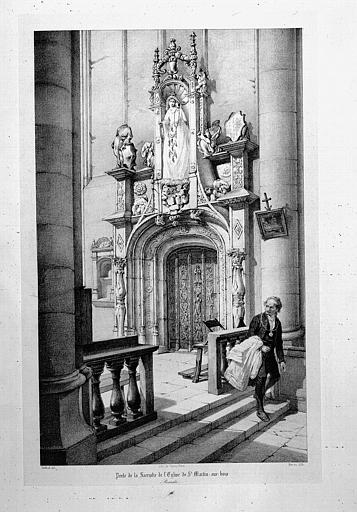 Cette porte est ornée d'un répertoire presque uniquement décoratif ; les thèmes religieux se limitent à la présence de trois sibylles représentées au centre de la porte et d'un calice. Ce décor est caractéristique de la première Renaissance en Picardie et permet d'attribuer la porte aux années 1520-25. Des décors assez proches se retrouvent aux portes de la façade occidentale de l'église de Maignelay-Montigny, ou encore dans des boiseries conservées à Gaillon, deux ensembles datés du 1er quart du 16e siècle. La date attibuée à cette porte d'après le décor est corroborée par les sources textuelles. On sait en effet qu'elle ferme la sacristie construite par l'évêque Guy de Baudreuil, le premier abbé commandataire de l'abbaye nommé en 1492. Cette construction a été effectuée sous sa direction, peu après 1521.