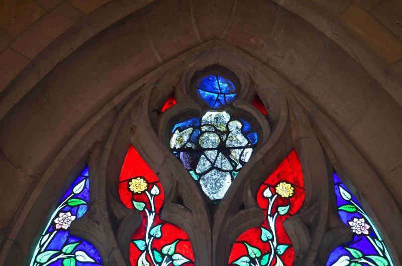 verre transparent (coloré, incolore) : soufflé, peint, grisaille sur verre, jaune d'argent ; plomb (réseau)