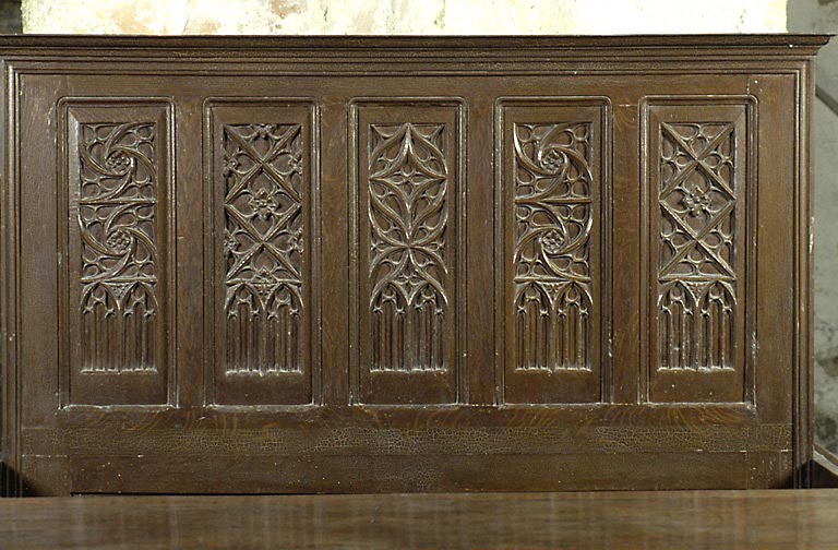 Les cinq panneaux datant du 16e siècle appartenaient au dossier d'un banc d'oeuvre en très mauvais état. Ils ont été remontés dans un nouveau dossier au 19e siècle. Le décor de ces panneaux peut être comparé à celui de divers panneaux et meubles conservés dans l'Oise (notamment au musée de Beauvais) et datés de la fin du 15e siècle ou du début du 16e siècle.