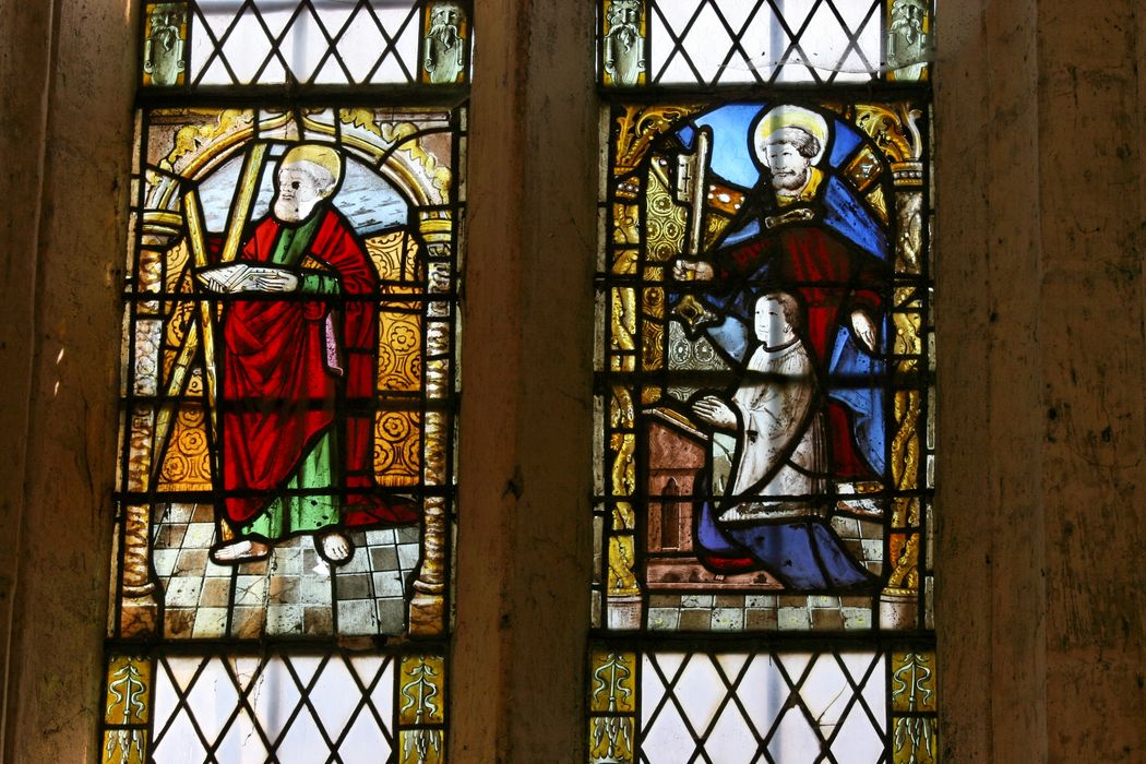 Baie 0 : baie à 1 lancette trilobée couronnée d'un trilobe. Au sommet de la lancette, Christ en croix entre lune et soleil. Deux anges recueillent le sang du Crucifié dans des calices. Dans le trilobe, Dieu le Père. Baie 8 : baie à deux lancettes trilobées. Les panneaux classés sont remontés au milieu des verrières. Dans la lancette droite, saint Pierre présente un ecclésiastique agenouillé. Dans la lancette gauche, saint André. Les 2 saints sont représentés sous des dais architecturés.
