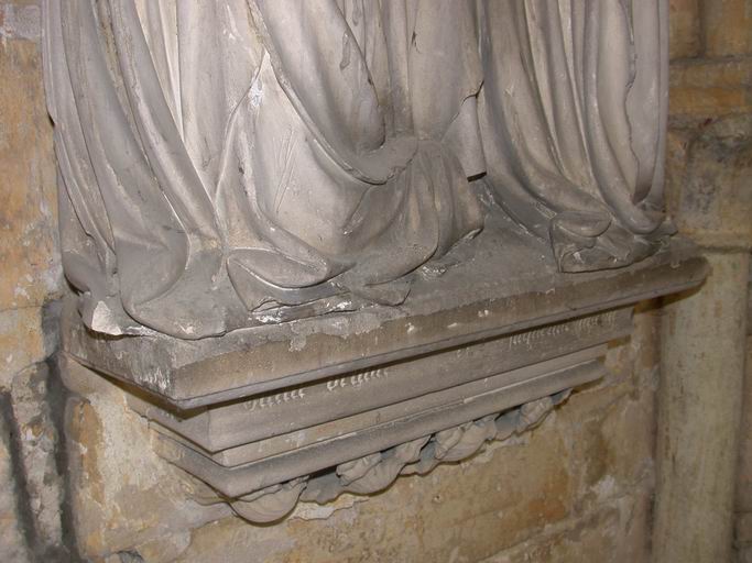Groupe découvert vers 1912 sous un autel. Le groupe sculpté du 1er quart du 15e siècle, par son matériau et son style, est à rapprocher de la statue de sainte ou Vierge de l'Annonciation, présente à côté dans la même église.'Les préjudices subis, sans doute à l'époque révolutionnaire, laissent planer certains doutes sur un ensemble - vraisemblablement commémoratif et non funéraire - dont nous ignorons la composition originelle et l'emplacement initial (...). Les Brunel, propriétaires en ce lieu dont ils étaient sans doute originaires (on les y suit depuis le début du XIVe siècle), avaient choisi pour nécropole familiale l'église où l'un des leurs avait fait une fondation et où plusieurs dalles gravées rappellent encore leur mémoire. (...) Membre de l'entourage du roi, Guillaume Brunel a pu faire appel à un artiste parisien, qui s'insère de façon assez personnelle dans le courant artistique de son temps : l'apôtre est drapé de manière peu innovante, mais les autres effigies dépendent nettement du gothique international. Elles présentent des affinités avec des ouvrages par ailleurs assez divers et ont été rapprochées des sculptures de La Ferté-Milon.' (F. Baron)