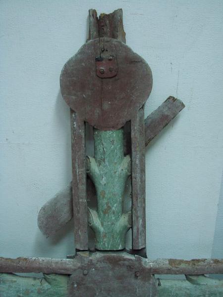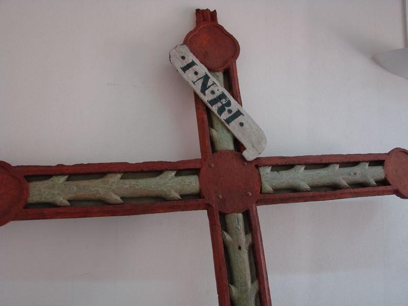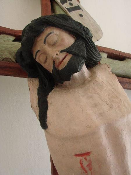 Christ en croix en bois sculpté et peint, dont les bras ont disparu, et sa croix en bois sculpté de branches écotées.