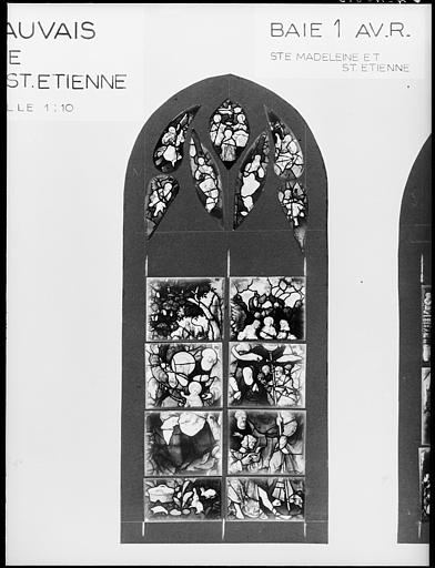 La verrière de la baie 1 est assez proche de celle représentant la Descente de Croix offerte par Louis de Roncherolles à la cathédrale Saint Pierre de Beauvais en 1522. D'après Jean Laffond, les deux verrières sont de la même main et donc à peu près contemporaine. Une partie de cette verrière (Dormition de la Vierge) est transférée dans la baie 2.