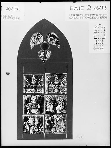 Au registre inférieur de la lancette de gauche, trois donatrices présentées par sainte Madeleine. Au registre inférieur de la lancette de droite, la lapidation de saint Etienne avec trois donateurs. Au registre supérieur de la lancette de gauche, le Repos pendant la Fuite en Egypte. A la lancette de droite, le Christ en croix entre la Vierge et saint Jean et deux anges portant des calices pour recueillir le sang du Christ. Au pied de la croix, sainte Marie Madeleine. La Vierge allaitant et sainte Anne sont figurées sous cette scène. Au tympan, dans la mouchette, la Nativité. Les registres supérieurs et inférieurs sont séparés par un registre décoratif avec des anges musiciens et des motifs ornementaux (feuillages, fruits, animaux fantastiques).