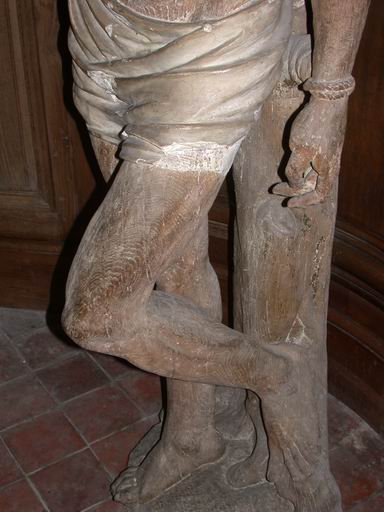 La statue est souillée par des fientes de pigeon. La main droite du saint a disparu. Son avant-bras a été refait en plâtre peint et une branche a été fixée sur le tronc auquel est attaché le saint pour soutenir ce bras. L'amorce de l'avant bras original encore en place indique que le bras était replié. Les traces d'enduits sont encore visibles, quelques traces de polychromie subsistent dans la chevelure et sur le tronc d'arbre.