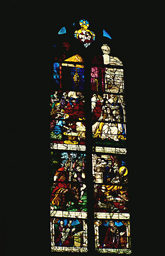 La verrière appartient à l'ensemble des verrières du choeur. Elle a été attribuée à Nicolas Leprince et exécutée en 1545. Elle a été restaurée en 1860 par le verrier Lévêque puis en 1954 par Gaudin.