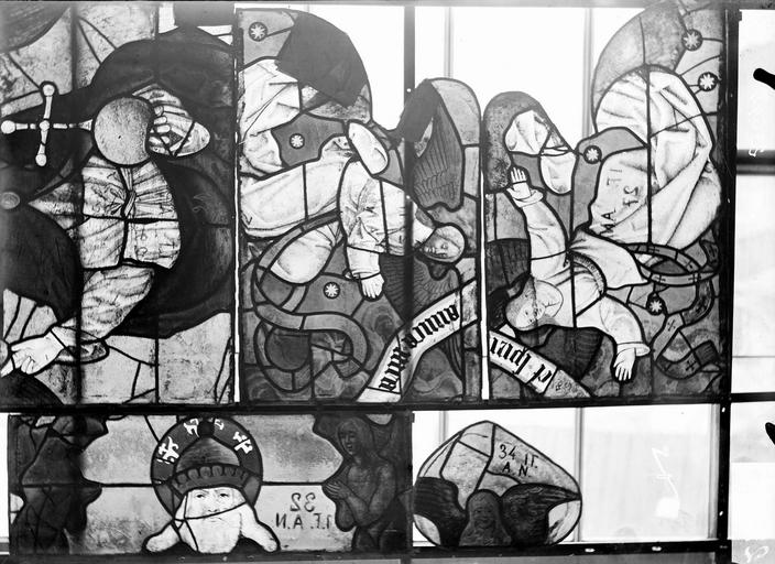 verre transparent (coloré) : soufflé, peint, grisaille sur verre, jaune d'argent ; plomb (réseau)
