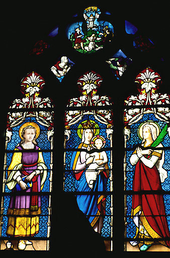 Fragment de verrière appartenant à l'ensemble homogène de vitraux datant de la première moitié du 16e siècle ; les personnages figurés dans les lancettes représentant de gauche à droite sainte Gabrielle, une Vierge à l'Enfant et sainte Laure datent d'après 1918 ; ces trois lancettes ne sont pas classées au titre des monuments historiques.