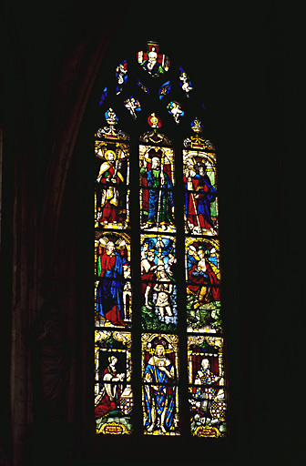 Verrière appartenant à l'ensemble des verrières du choeur données par Raoul de Lannoy en 1520 ; l'ensemble a été fortement restauré, recomposé et complété en 1867 par le verrier Bazin.
