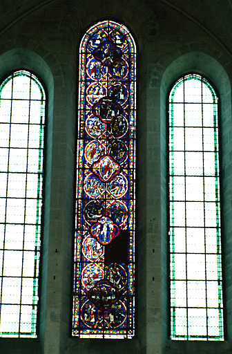 Cette baie d'axe illustrant les scènes de la Passion et de la Résurrection du Christ date des années 1230. Le panneau manquant dans le deuxième registre devait figurer le Portement de croix. Cette verrière a été largement restaurée en 1868.
