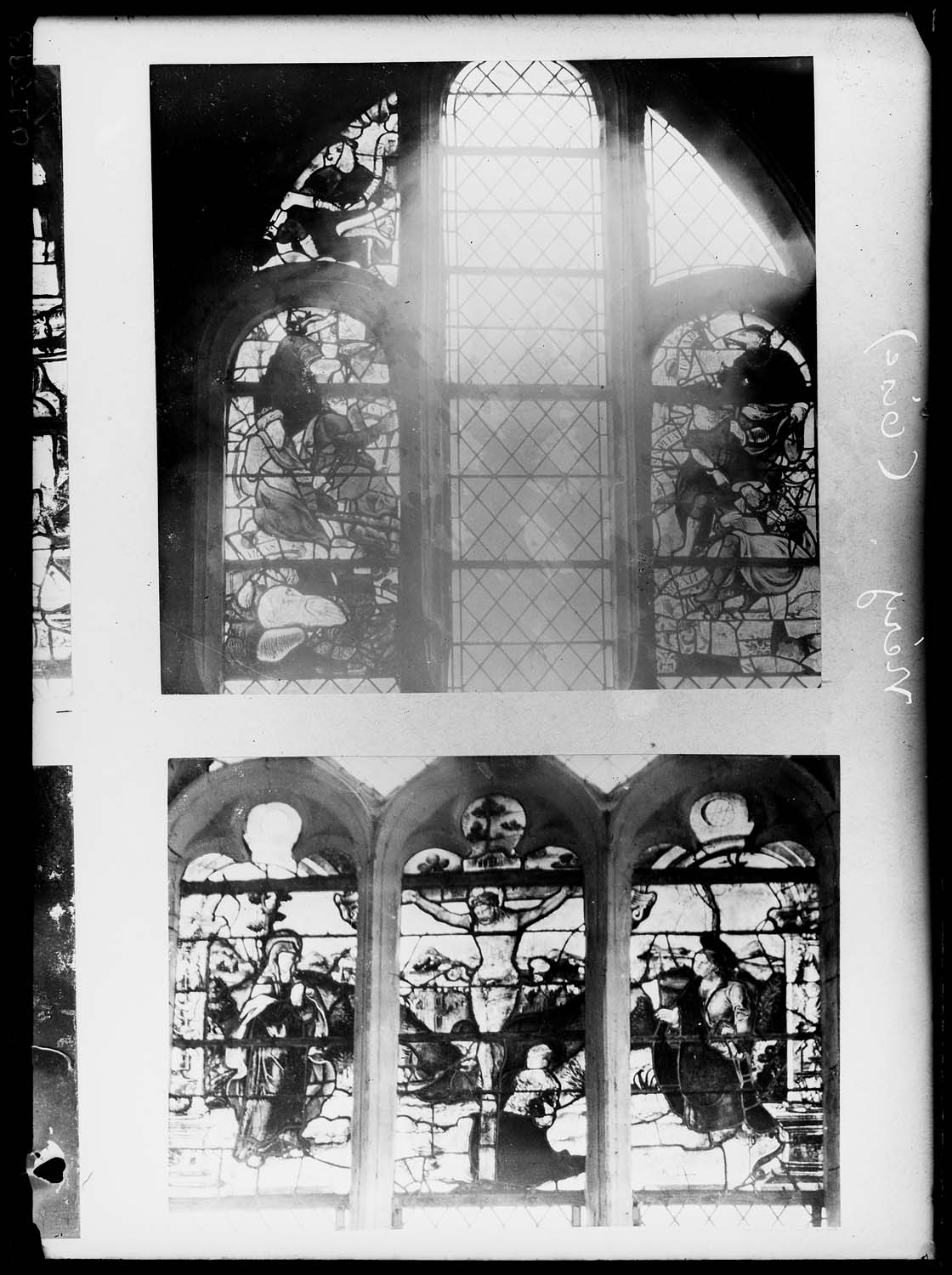 Ensemble de 6 panneaux (4 rectangulaires, 2 semi-circulaires) remontés dans une vitrerie moderne incolore composée de 2 lancettes et d'un tympan ajouré.