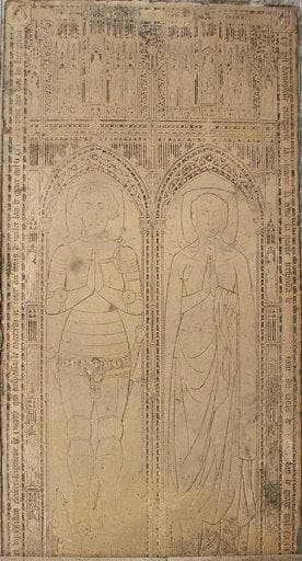 Plaque funéraire rectangulaire en calcaire, gravée d'un décor d'architecture gothique et de deux gisants : un homme en armure, une femme en robe et guimpe.