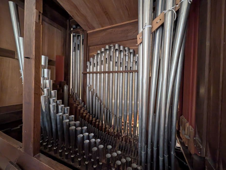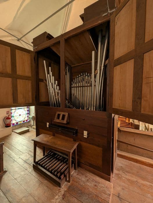 Extérieurement, le buffet présente un panneau plat composé de treize tuyaux, encadré par deux tourelles comportant chacune 5 tuyaux. Une petite statue est placée sur la façade de l'orgue.