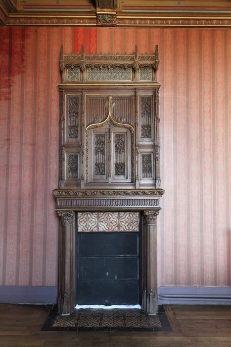 Manteau de cheminée en bois taillé de style néogothique, à décor flamboyant.