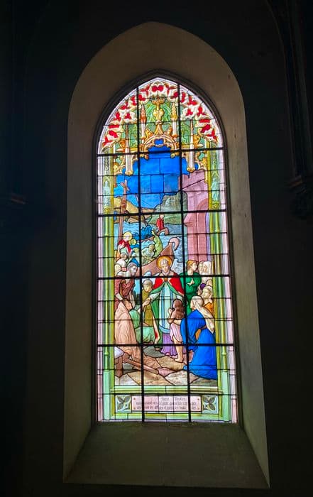 POP | Plateforme ouverte du patrimoineensemble de trois verrières (baies 0, 1, 2) : Sacre de saint Nicolas de Myre ; Sauvetage des matelots par saint Nicolas de Myre ; Miracle des trois bourses