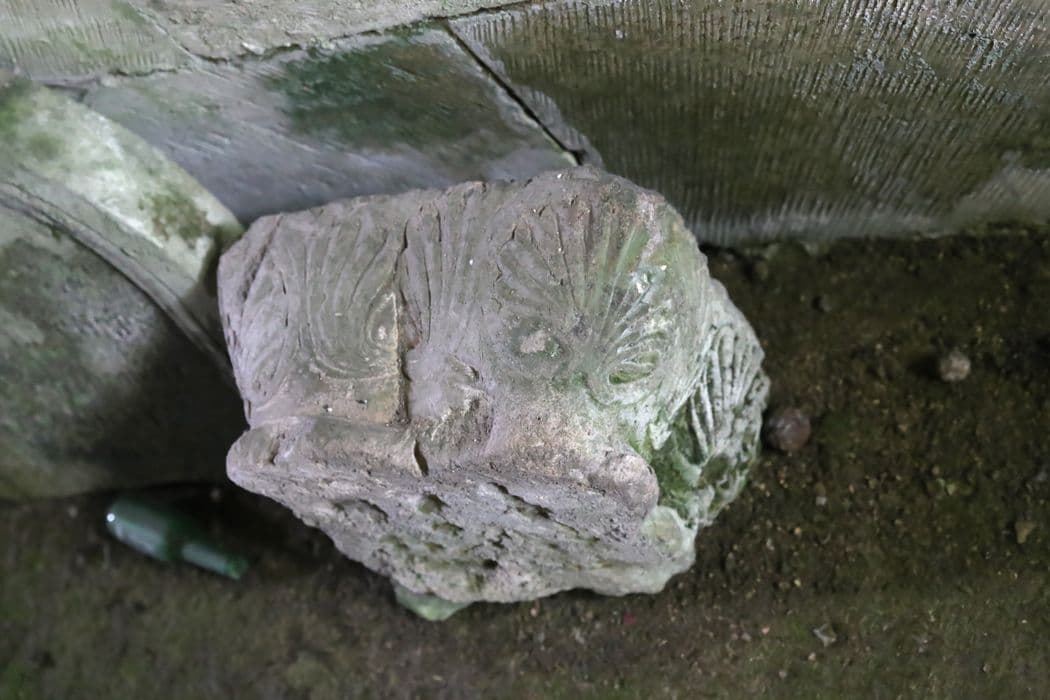 Chapiteau double orné de feuilles stylisées taillées en gouttière.