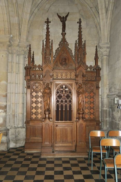 Confessionnal de style néogothique, orné d'une statuette d'ange et de deux statues.