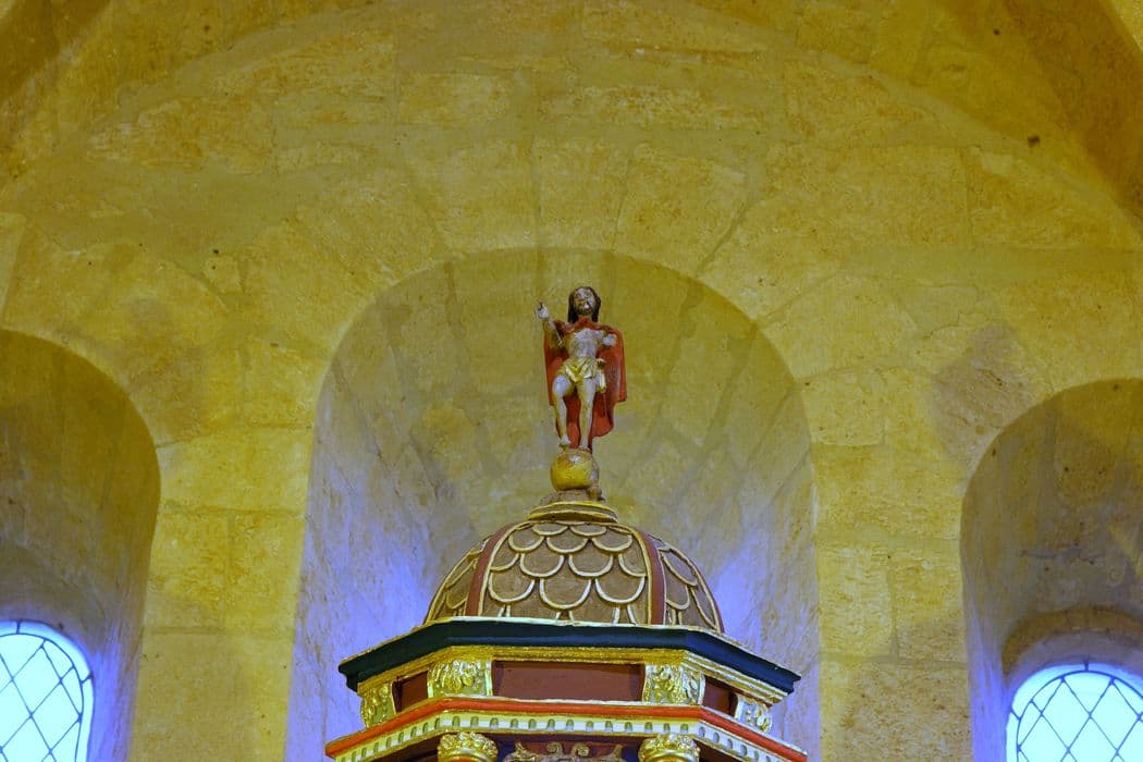 Retable de l'ancien maître-autel en bois polychrome, comportant une statuette : Christ dominant le monde.
