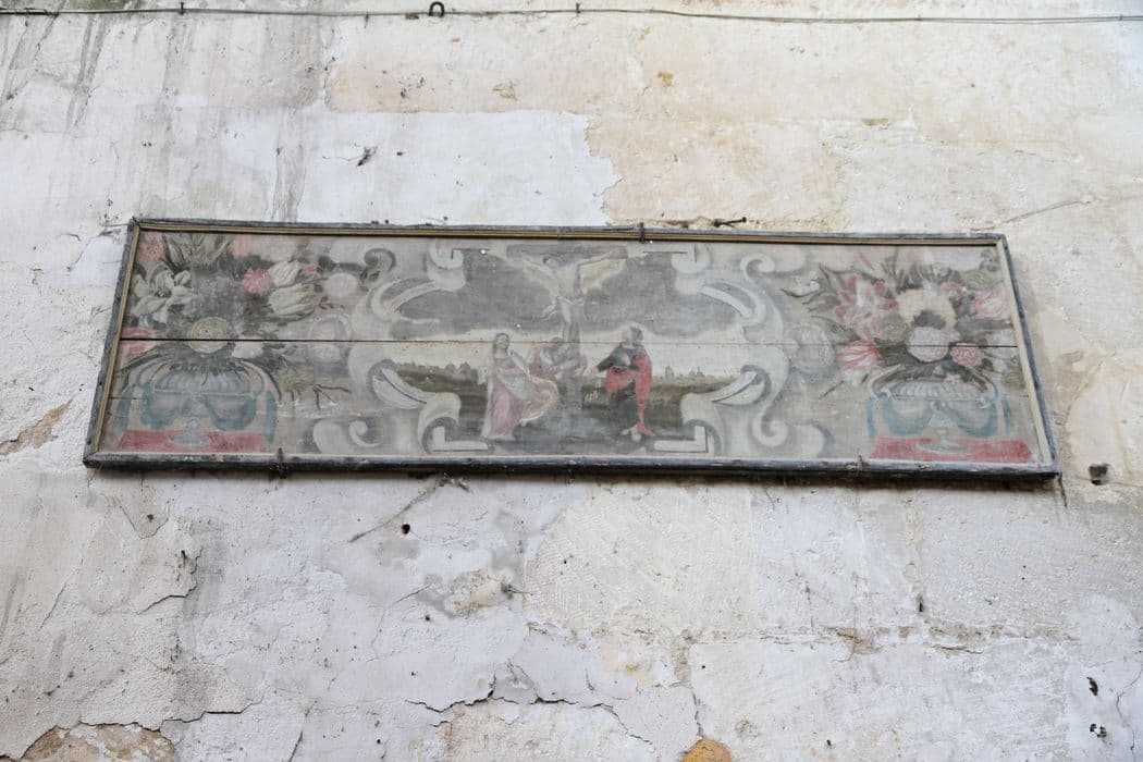 Tableau (panneau peint) figurant dans un médaillon un calvaire avec paysages de ville et de campagne en arrière-plan, de part et d'autre duquel se trouvent deux natures mortes de fleurs.