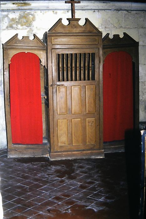 Confessionnal daté du 19e siècle constitué notamment du remontage d'éléments du 17e siècle, parmi lesquels une porte à petits balustres.