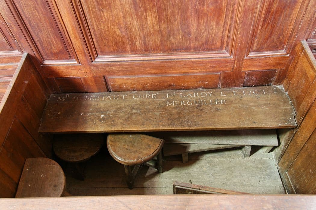 Banc d'oeuvre en bois taillé et ciré portant une inscription gravée sur le siège.
