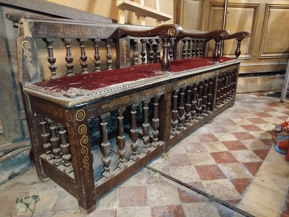 Banc à trois places avec assise en velours rouge récent et inscription en doré sur le dossier, auquel manque un accotoir.