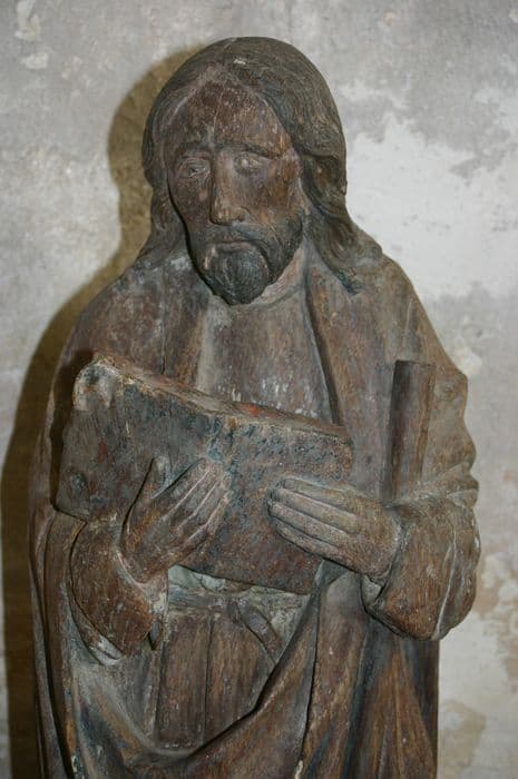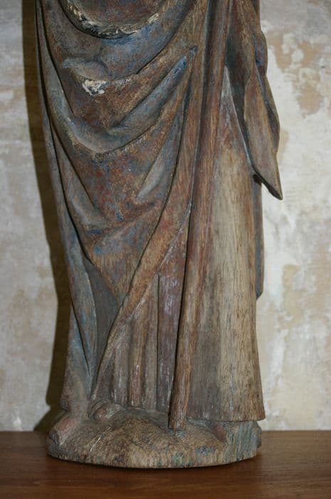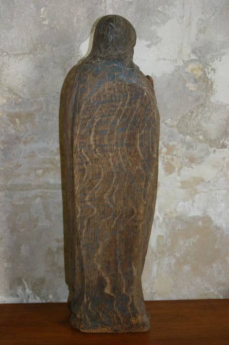 Statue en bois taillé (revers plat) et peint (traces de polychromie) où manque le haut du bâton et à la base de laquelle sont visibles les traces d'insectes xylophages.