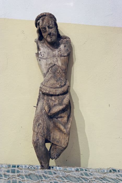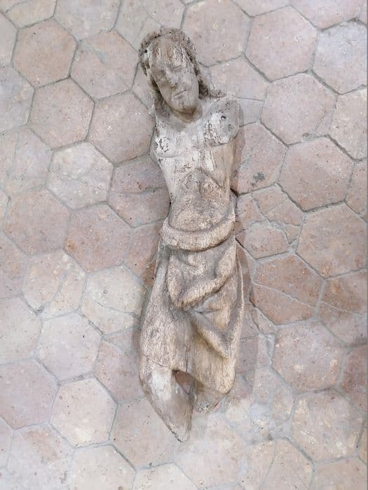 Statue en bois taillé et peint avec traces de polychromie. ; mutilée, il y manque les bras et la partie inférieure du corps, et certaines zones sont vermoulues.