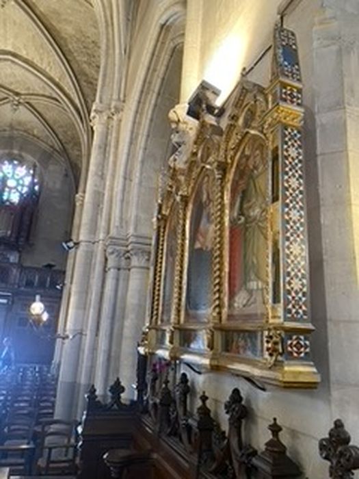 Triptyque attribué à Jacopo di Cione, à l'atelier de Lippo Memmi et à l'entourage du Maestro della Dormitio di Terni ou de Spinello Aretino. Retable en forme de triptyque dont le titre repose sur une tradition iconographique locale pouvant être remise en question. Appartient à la commune d'Ermenonville depuis le don que lui firent en 1886 le prince Constantin Radziwill et sa femme, alors propriétaires du château d'Ermenonville. Exécuté a tempera sur bois, l'ensemble des panneaux peints, qui peut être daté du XIVe siècle, a été incorporé dans un montage antiquaire au XIXe siècle. Outre cet encadrement en bois sculpté, peint et doré de belle facture, l'assemblage a été enrichi de quelques blasons flatteurs comme ceux des Médicis apposés aux angles et a fait l'objet de repeints extrêmement importants. L'oeuvre a été étudiée par Constance Calderari-Froidefond dans le cadre de son mémoire sur La peinture italienne [XIVe-XVIIIe] dans l'Oise : collections des églises et des musées territoriaux, soutenu à l'Ecole du Louvre en 2015. Les attributions qu'elle a établies avec l'aide de spécialistes reconnus ont permis d'avancer les noms mentionnés ci-après. On peut estimer que les trois panneaux principaux, les trois tondi placés au-dessus et les petits anges peints au sommet des pinacles sont tous de la main de Jacopo di Cione (vers 1320-peu avant 1400), un peintre florentin dont l'activité est documentée à la fin du XIVe siècle. Le remontage comprend quatre saints. Ces figures seraient de l'entourage de Lippo Memmi, un peintre siennois actif entre 1317 et 1350, dont la production est parfois confondue avec celle de Simone Martini. Arbitrairement recoupées et juxtaposées pour composer la prédelle, les trois compositions dépeignant des scènes de la vie de sainte Catherine d'Alexandrie ont été attribuées par les spécialistes à l'entourage du Maestro della Dormitio di Terni ou de Spinello Arettino, tous deux actifs à la charnière du XIVe et du XVe siècles. La qualité indéniable du remontage du XIXe siècle et l'appartenance des trois peintres à un même espace géographique et temporel, à savoir la Toscane ou l'Ombrie de la fin du XIVe siècle et du début du XVe siècle, donnent à l'ensemble sa cohérence esthétique. L'oeuvre a été retenue pour figurer à l'exposition Heures italiennes, en Picardie, du printemps à l'automne 2017.