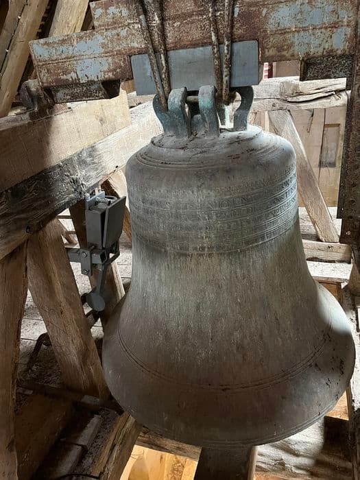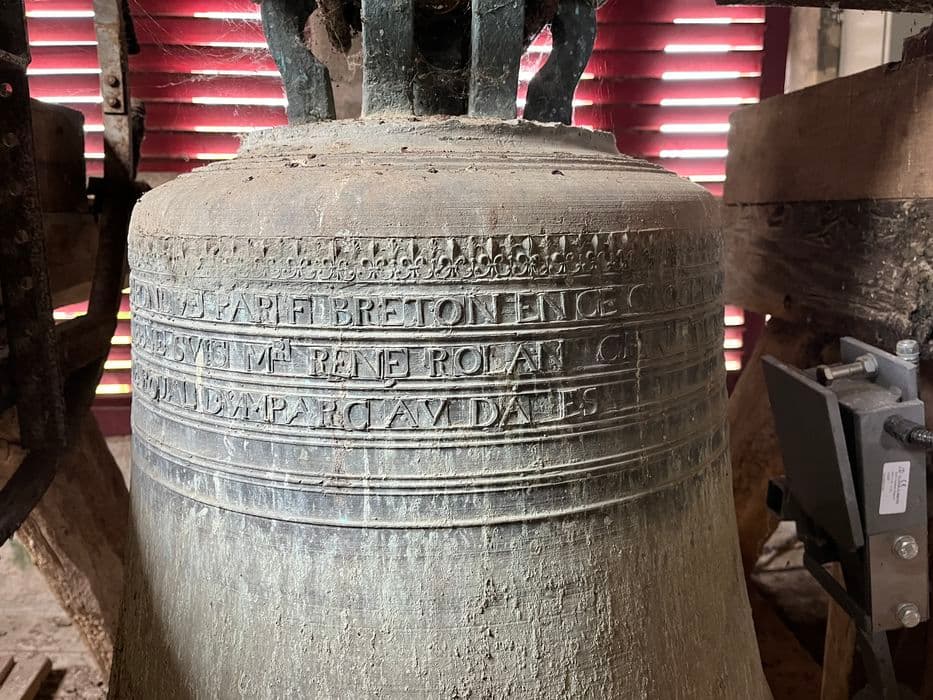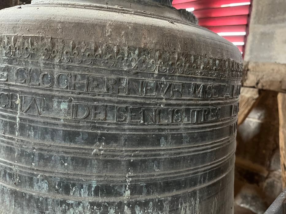 Anse de type couronne : six anses aux arrêtes droites, sans décor. Frise avec décor formé d'une alternance de fleurs de lys et de palmettes dressés. Inscription posée sur cinq bandeaux. Note : sol 3. Battant ancien déposé dans le choeur.