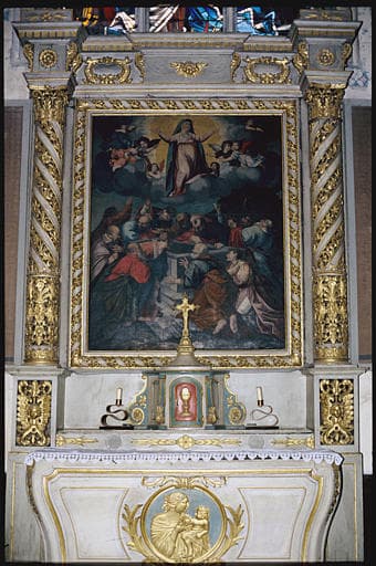Autel latéral avec deux colonnes torsadées dont le décor floral est ajouré. Toile l'Assomption de la Vierge (h = 200, la = 230) datée de 1698 encadrée de deux colonnes à bandes torsadées supportées par deux piliers décorés d'une tête d'angelot.