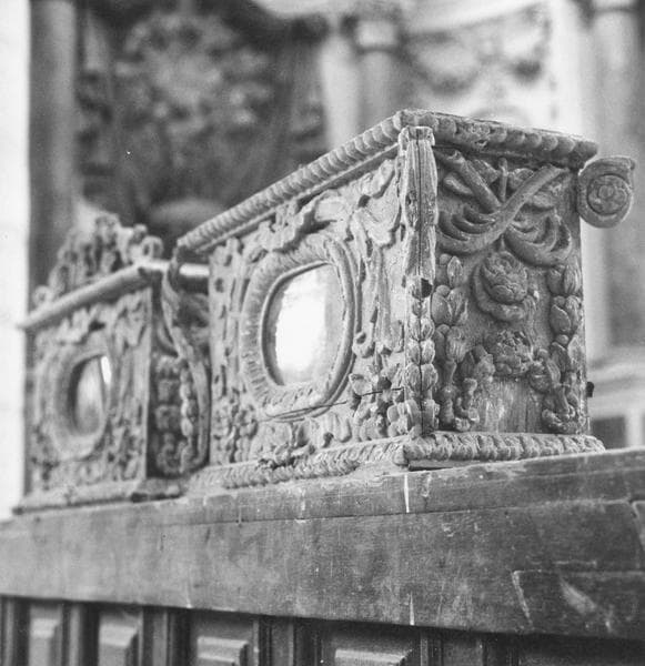 Ces reliquaires, dont trois sur quatre ont été conservés, se présentent sous la forme d'un coffre en bois jadis doré, avec une vitre latérale enchâssée dans un ovale, et entouré de rinceaux et de chutes de fruits ; les petits côtés sont ornés de fleurs et de palmettes.
