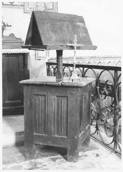 Lutrin avec un meuble pour ranger les livres. Panneaux à plis de serviette (en honneur jusqu'au 17e siècle dans le Perche). Support du porte-livre à écailles.