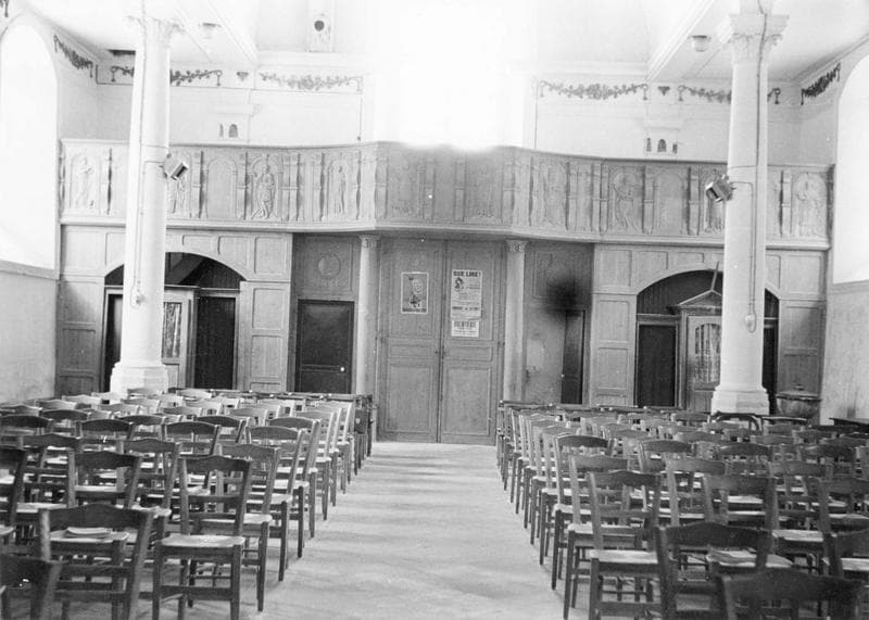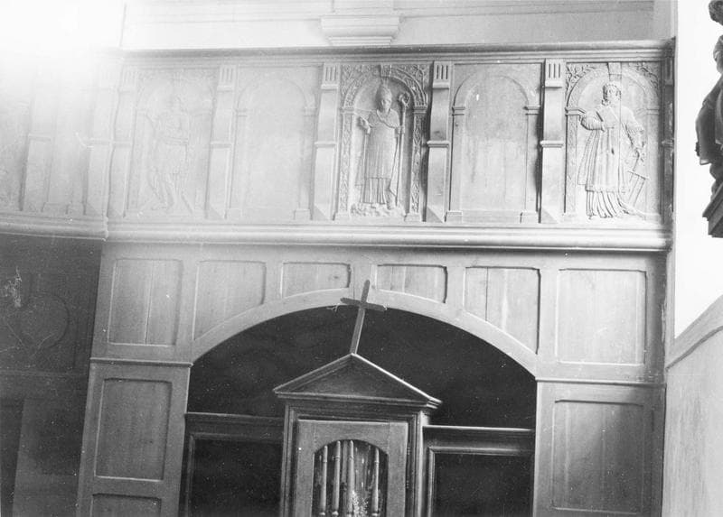 La tribune est supportée en son centre par deux colonnes avancées. Une dizaine de personnages sont sculptés en faible relief sous arcade vide entre chacun d'eux.