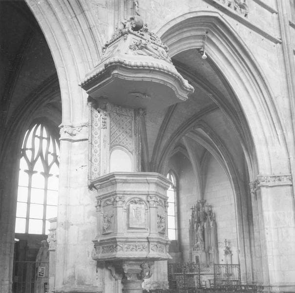 Cette chaire est en pierre blanche en partie dorée, à sujets du Nouveau Testament en reliefs. L'escalier est pratiqué dans l'épaisseur du pilier contre lequel elle s'appuie.