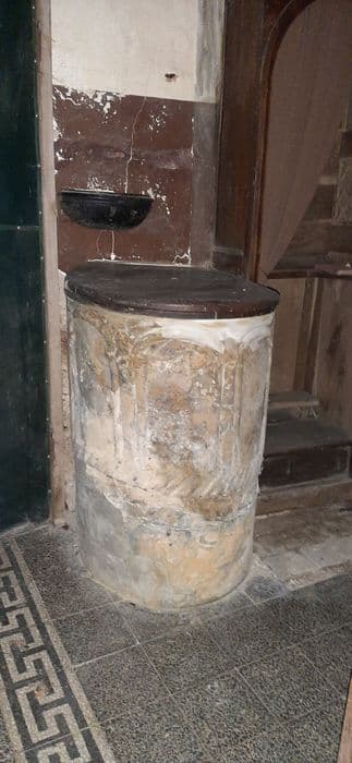 Cuve baptismale cylindrique à décor d'arcature en bas-relief.