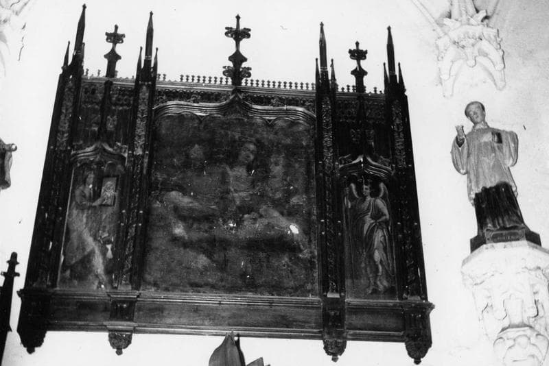 Deux toiles et un panneau peint : l'archange Gabriel. Cadre néo-gothique.