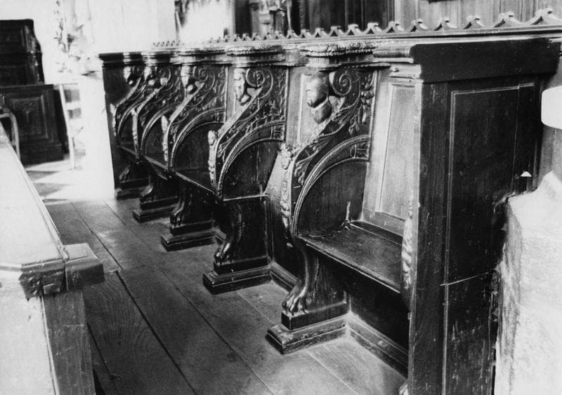 Six stalles. Deux groupes de trois stalles, deux groupes de cinq stalles, deux bancs de confrérie.